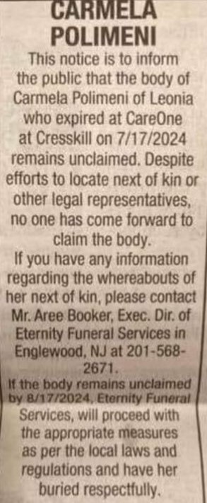 A listing was posted in a local Bergen County newspaper about Carmela Polimeni. Now, I will say upfront I do not know this woman. But she’s a Jersey Girl, just like me. And sadly, she passed away in July. What is even more sad is that no one has claimed her as a family member.